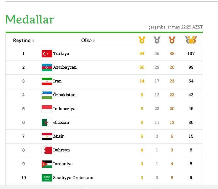 Birinci yeri 54 qızıl medalla Türkiyə, üçüncü pilləni 14 qızıl medalla İran tutur.