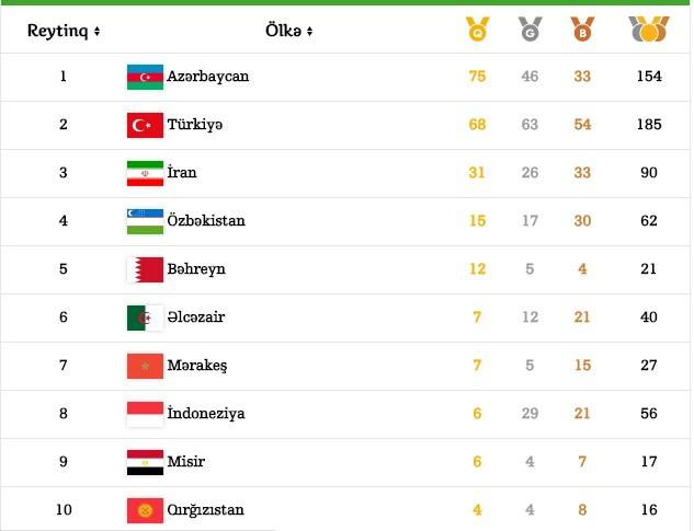 Qol.az-ın xəbərinə görə, mayın 21-i günün sonunda komandamızın ehtiyatındakı qızıl medalların sayı 75-ə çatıb. Türkiyə 68 qızılla 2-ci, İran 31 qızılla 3-cü yeri tutur.