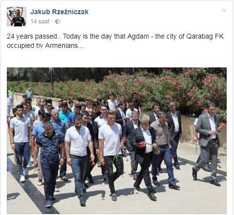 Qol.az-ın məlumatına görə, polşalı müdafiəçi özünün "Facebook" hesabından rəhbərlik və bir neçə futbolçu ilə birlikdə ziyarət etdiyi Şəhidlər Xiyabanının şəklini paylaşıb. 31 yaşlı oyunçu şəklin üzərinə isə bu sözləri yazıb: “24 il keçdi... Bu gün “Qarabağ” klubunun doğma məmləkəti olan Ağdamın ermənilər tərəfindən işğal olunduğu gündür”.
