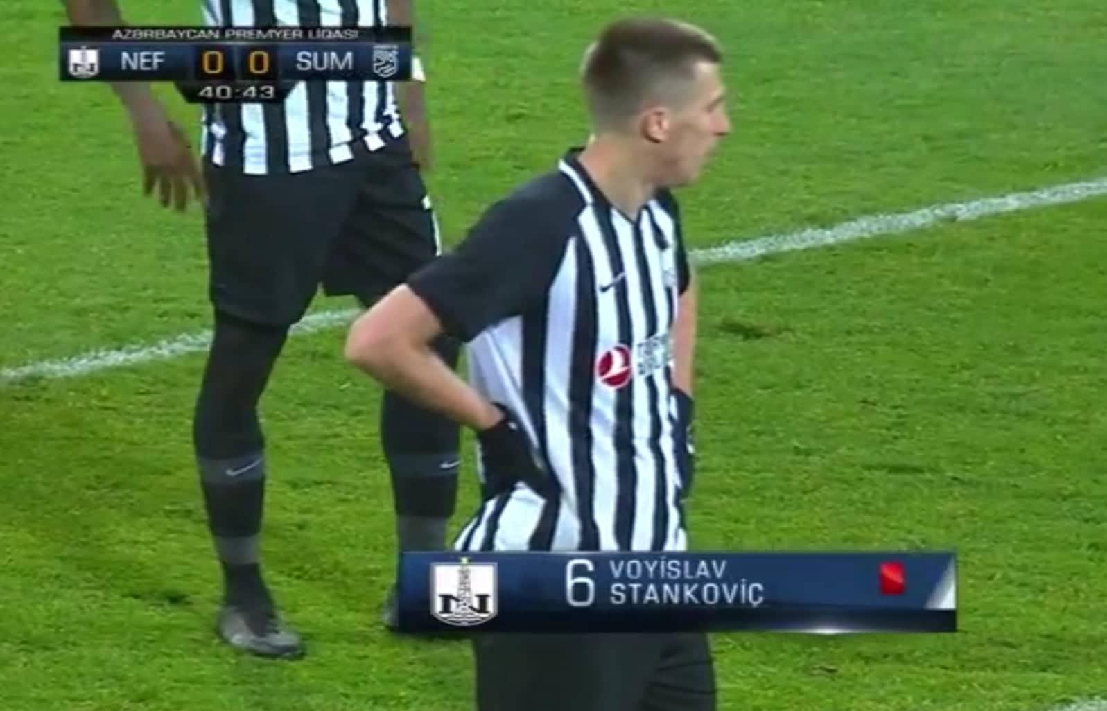 Qol.az xəbər verir ki, Voyislav Stankoviç 41-ci dəqiqədə sonuncu ümid fouluna görə birbaşa qırmızı vərəqə ilə cəzalandırılıb. Bundan sonra "Neftçi"nin qapısına cərimə zərbəsi təyin olunub və "Sumqayıt"ın futbolçusu Rəhim Sadıxov 43-cü dəqiqədə hesabı açıb.