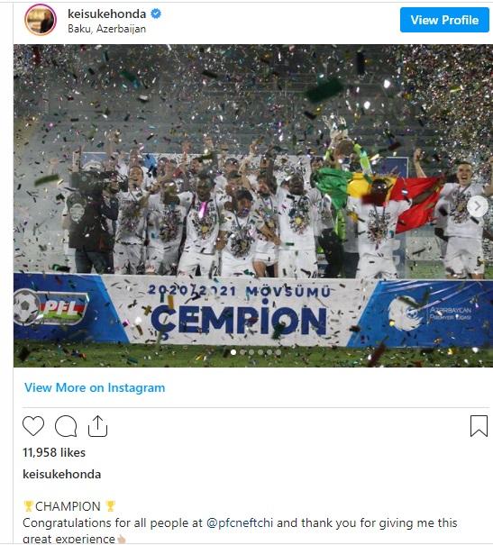 "Neftçi"nin futbolçusu Keysuke Honda Azərbaycan çempionu olmaları ilə bağlı özünün "İnstaqram" səhifəsində paylaşım edib.