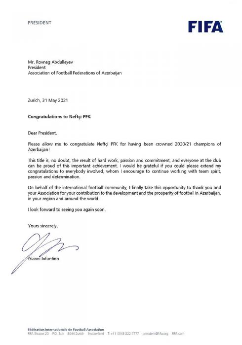 FİFA-nın prezidenti Canni İnfantino "Neftçi" Peşəkar Futbol Klubunu Azərbaycan Premyer Liqasının 2020/2021-ci il mövsümünün qalibi olması münasibətilə təbrik edib.