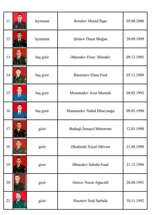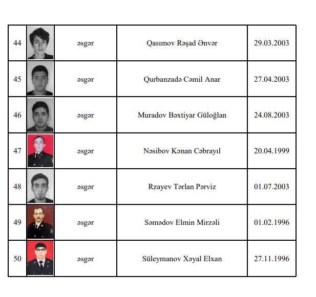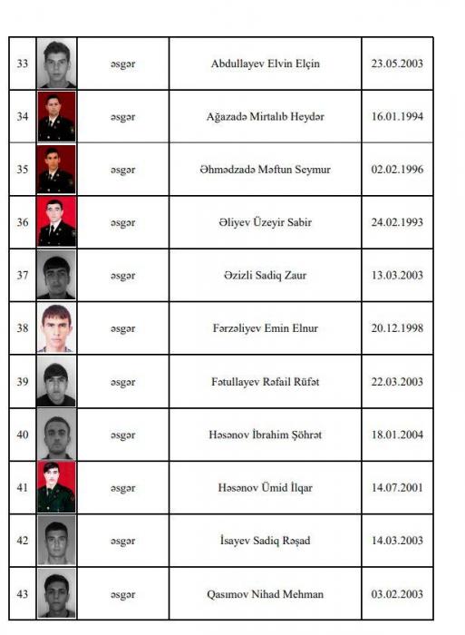 Şəhid olan hərbçilərimizin siyahısını təqdim edirik: