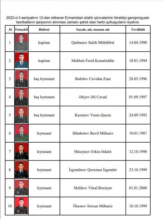 Azərbaycan Müdafiə Nazirliyi Ermənistan silahlı qüvvələrinin törətdiyi təxribatların qarşısının alınması zamanı şəhid olan hərbi qulluqçuların siyahısını açıqlayıb.