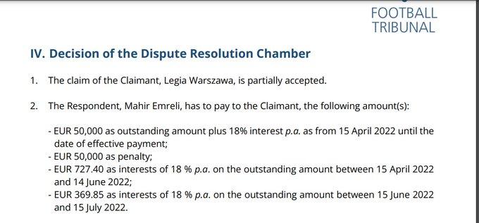 O bildirib ki, 25 yaşlı hücumçu Polşa klubu qarşısında maliyyə öhdəliklərini yerinə yetirmədiyi üçün futbolla bağlı bütün fəaliyyətinə qadağa qoyulub. Qərara görə “Legiya”dan qalmaqallı şəkildə ayrılan Emreli Polşa klubuna 100 min avro ödəməlidir. Qadağa Mahir borcunu ödəyənə qədər qüvvədə olacaq.