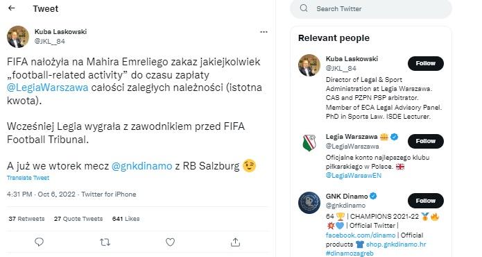 Qol.az xəbər verir ki, bu barədə Emrelinin sabiq klubu "Legiya"nın hüquqi və inzibati işlər üzrə direktoru Yakub Laskovski öz Tvitter səhifəsində paylaşım edib.