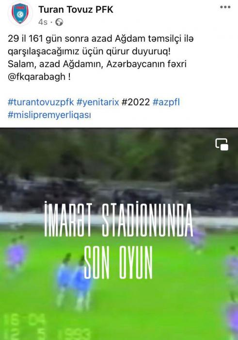 “29 il 161 gün sonra azad Ağdam təmsilçi ilə qarşılaşacağımız üçün qürur duyuruq! Salam, azad Ağdamın, Azərbaycanın fəxri!”