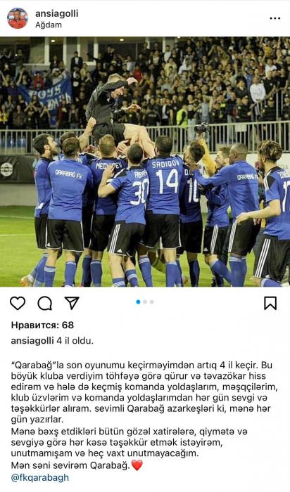 “Qarabağ”la son oyunumu keçirməyimdən artıq 4 il keçir. Bu böyük kluba verdiyim töhfəyə görə qürur və təvazökar hiss edirəm və hələ də keçmiş komanda yoldaşlarım, məşqçilərim, klub üzvlərim və komanda yoldaşlarımdan hər gün sevgi və təşəkkürlər alıram. Sevimli "Qarabağ" azarkeşləri mənə hər gün yazırlar.