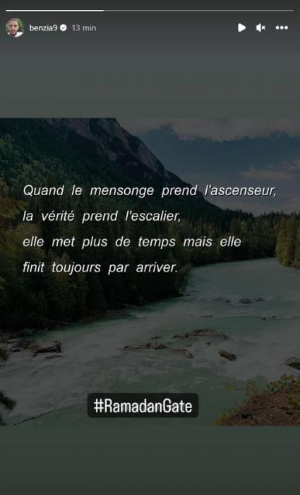 Qol.az xəbər verir ki, o, paylaşımında yazıb: "Yalan liftlə, doğru pilləkənlə qalxanda, bu, böyük vaxt aparır, amma keçib gedir". Benzia bu paylaşımı #RamadanGate (Ramazan qapısı) həştəqi il paylaşıb ki, bu da bir fransız saytının diqqətini çəkib.