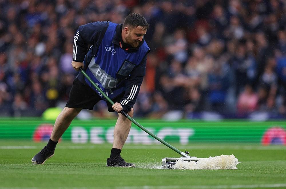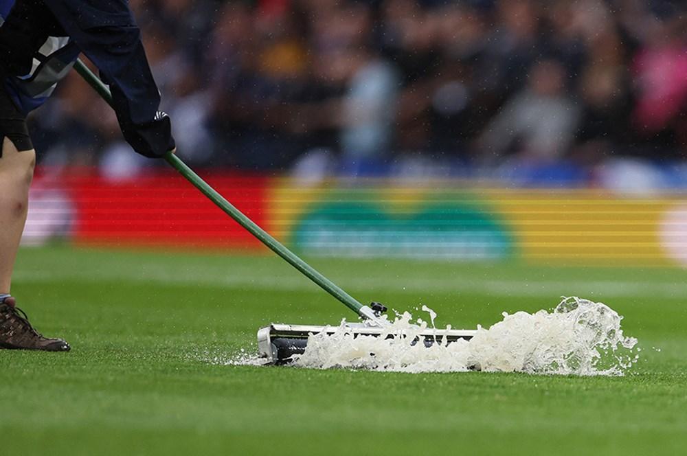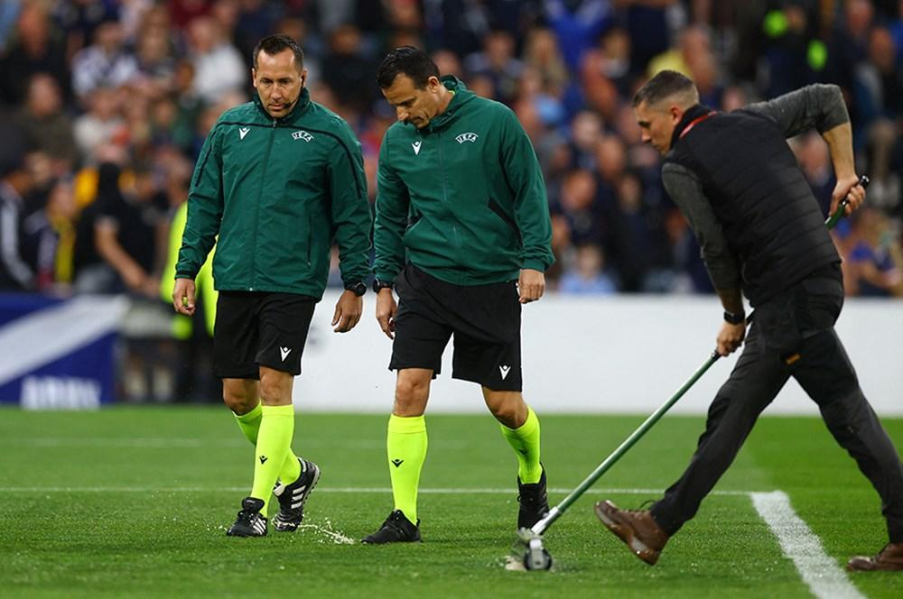 Qol.az xəbər verir ki, buna görüşün keçirildiyi Hampden Park Stadionuna güclü yağışın yağması səbəb olub. Baş hakim İstvan Vad 10-cu dəqiqədə matçı yarımçıq dayandırıb və futbolçuları paltardəyişmə otağına göndərib. Meydanın sudan təmizlənməsi üçün işlər görülür. Qarşılaşmanın davam edib-etməyəcəyinə hakim qərar verəcək.