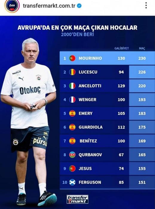 "Transfermarkt" portalı 2000-ci ildən bəri avrokuboklarda baş məşqçi kimi ən çox iştirak edən mütəxəssislərin siyahısını açıqlayıb.