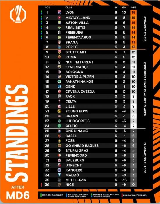 Qeyd edək ki, Liqa mərhələsini ilk 8 pillədə başa vuran komandalar birbaşa 1/8 finala yüksələcək. 9–24-cü yerləri tutan kollektivlər isə pley-off mərhələsində qarşılaşacaq və bu raundun qalibləri də 1/8 finalda oynamaq hüququ qazanacaq.