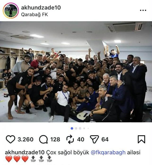 22 yaşlı hücumçu "Qarabağ"ın heyətində keçirdiyi oyunlarda çəkilən fotoları izləyiciləri ilə bölüşüb. Nəriman bu sözləri yazıb: "Çox sağ ol, böyük "Qarabağ" ailəsi!"