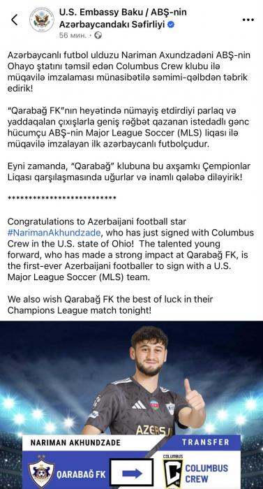 "Azərbaycanlı futbol ulduzu Nariman Axundzadəni ABŞ-nin Ohayo ştatını təmsil edən Columbus Crew klubu ilə müqavilə imzalaması münasibətilə səmimi-qəlbdən təbrik edirik!