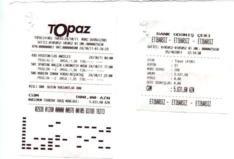 Qalib gəlmiş “Topaz” kuponlarında Türkiyə Superliqası, Rusiya Premyer Liqası və Amerika Major Liqasının oyunları göstərilmişdir. “Topaz” mərc oyunu iştirakçısının kuponlarda verilən proqnozların düzgün analizi və komandaların öncəki oyunlarını izləməsi onun 12495 Manat qazanmasını təmin edib.