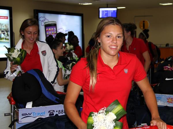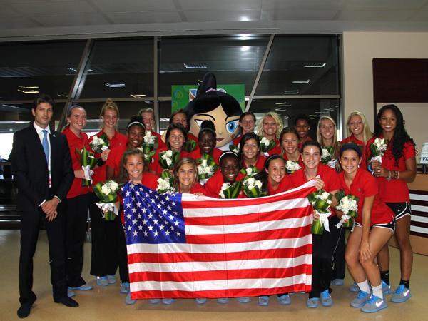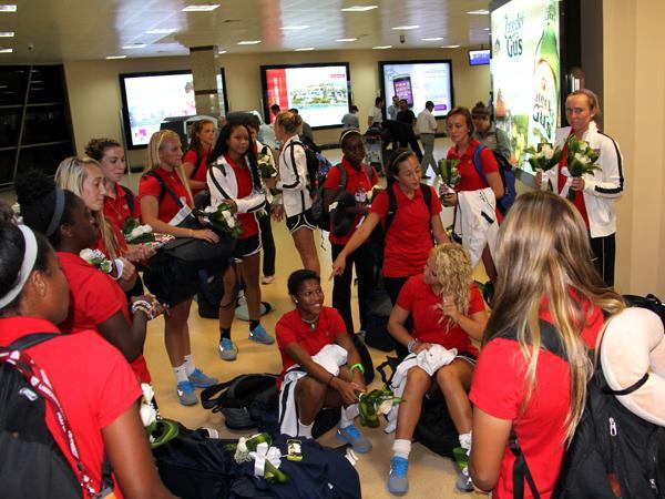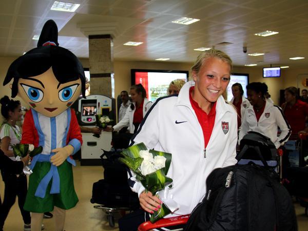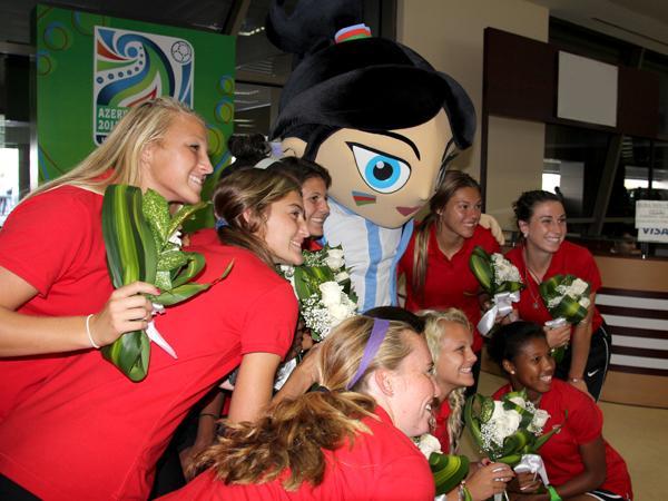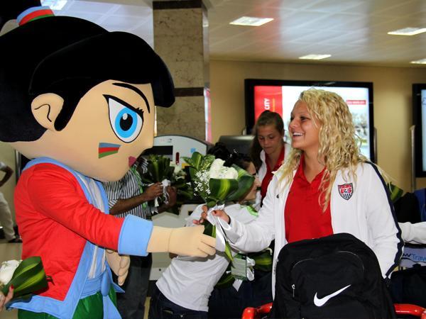 Dünya çempionatının rəsmi maskotu Top Top Qız bu dəfə də qarşılama ənənəsinə sadiq qalaraq, qonaqları hava limanında qarşılayıb və onlara gül buketləri təqdim edərək qonaqpərvərliyini nümayiş etdirib. Daha sonra qrup şəkli çəkdirən ABŞ milli komandasının oyunçuları və nümayəndə heyəti kiçik fotosessiyanın ardından qalacaqları otelə yola düşüblər.