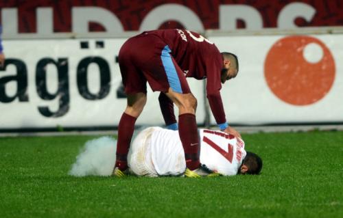Qol.Az-ın məlumatına görə, matçın 59-cu dəqiqəsində azarkeşlərdən birinin meydançaya atdığı yad əşya sabiq "Trabzonspor"lu futbolçunun başına tuş gəlib.
