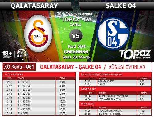 Fevralın 20-də saat 23:45-də başlanacaq qarşılaşma “Topaz” futbol proqramında 584 oyun kodu ilə göstərilib. Qızıl proqramda "Qalatasaray"ın qələbəsinə verilən əmsal 2.00, bərabərlik 3.30, "Şalke"nin qələbəsi isə 2.90 əmsalı ilə verilib.
