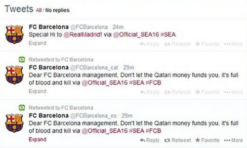 Klubun hesabını bir müddətlik ələ keçirən hakerlər sosial şəbəkədə "Real" Madrid"ə salam" və "Barselona" rəhbərliyi Qətərin pullarını xərcləməyin. O pullar qan və qətliamın məhsuludur" kimi mesajlar öz əksini tapıb.
