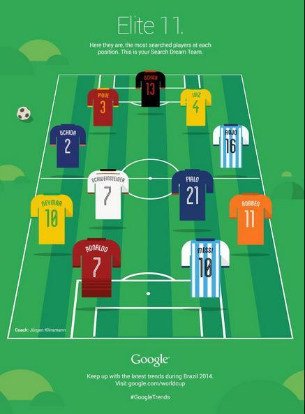 "Google" internet səhifəsində ən çox axtarışa verilən 11 futbolçu aşağıda adları qeyd olunanlardır: