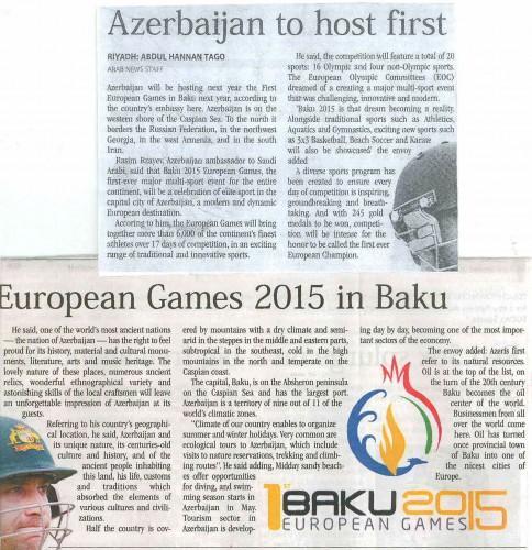 Azərbaycanın Səudiyyə Ərəbistanındakı səfirliyinin təşəbbüsü ilə bu ölkənin ingilisdilli “Arab News” qəzetində gələn il Bakıda keçiriləcək birinci Avropa Oyunları haqqında məqalə dərc edilib.