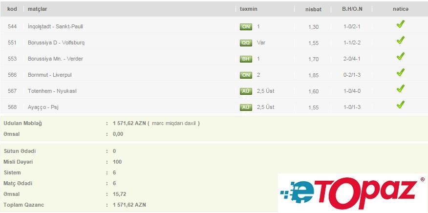 Qol.Az-ın xəbərinə görə, bir istifadəçinin 6 oyun üzrə qeyd etdiyi 100 manatlıq kuponu ona 1571.62 AZN qazandırıb.