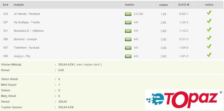 6 matça cəmi 1 manat pul qoyuluşu edən daha bir oyunçunun kuponu ona 292.64 AZN qazandırıb.