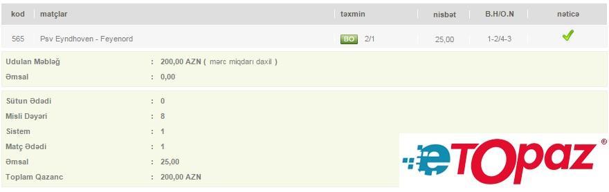 1 matça 8 manat pul qoyuluşu edən daha bir oyunçunun kuponu ona 200 AZN qazandırıb.