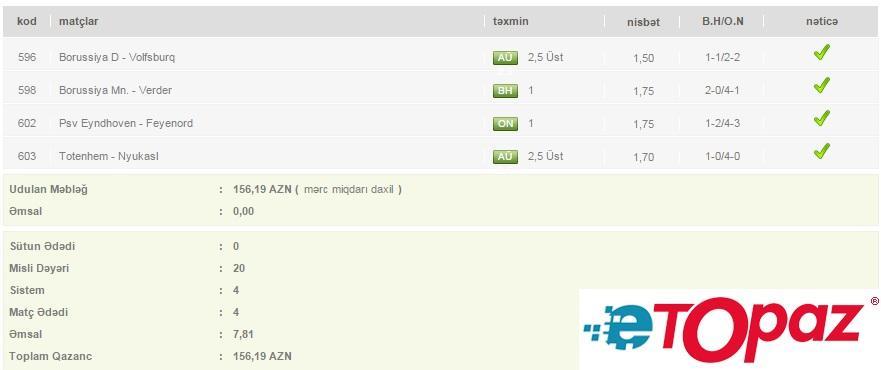 Digər bir istifadəçinin 4 oyun üzrə qeyd etdiyi 20 manatlıq kuponu ona 156.19 AZN qazandırıb.