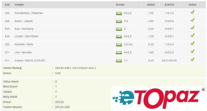 7 matça cəmi 1 manat pul qoyuluşu edən daha bir oyunçunun kuponu isə ona 233.34 AZN qazandırıb.