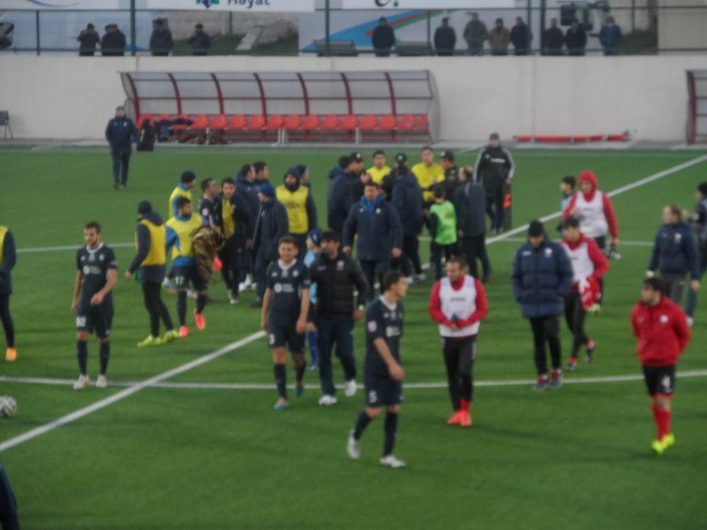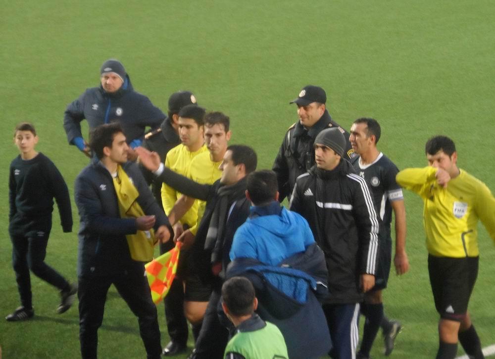 "Sumqayıt" futbolçuları hakimə kəskin etiraz etsələr də, qərar dəyişməyib. Topa yaxınlaşan Cavid Hüseynov isə qonaqları məğlubiyyətdən xilas edib. Hakimin final fitindən sonra isə ara yenidən qarışıb. Azarkeşlər referini təhqir edərək, onun ünvanına qeyri-etik ifadələr səsləndiriblər, üzərinə butulka və alışqan atıblar. "Sumqayıt"ın prezidenti Kamran Quliyev isə birbaşa meydanya daxil olaraq Rəhim Həsənova etirazını daha kəskin şəkildə bildirib. Klub prezidenti üzünü Rəhimə, əlini isə tribunaya tutaraq "eşidirsən, sənə nə deyirlər" ifadəsini işlədib.