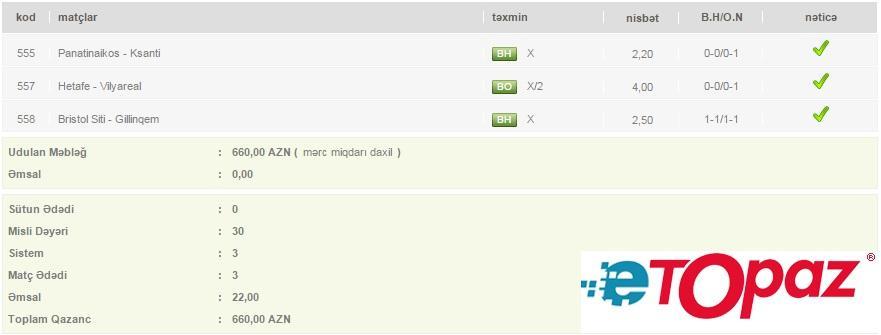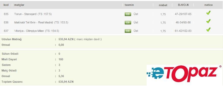 Azərbaycanda mərc oyunlarının yəganə elektron ünvanı - www.etopaz.az –da 29 yanvar tarixdəki mərc oyunlarının bəzi uduşlu kuponları