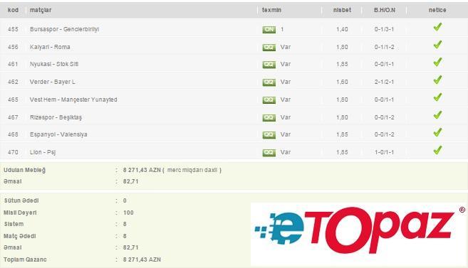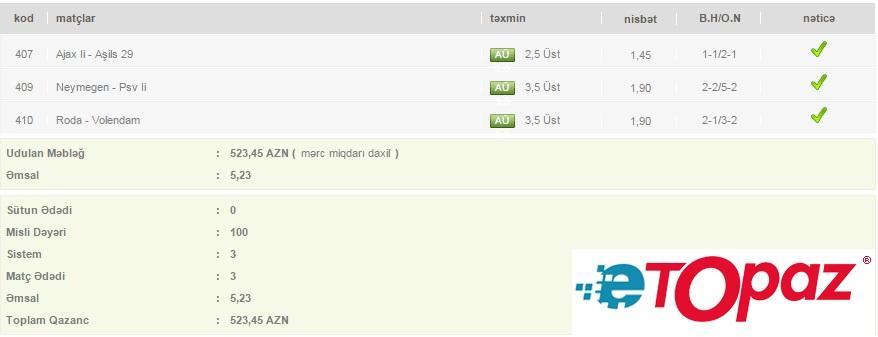 Azərbaycanda mərc oyunlarının yəganə elektron ünvanı - www.etopaz.az –da 9 fevral tarixdəki bəzi uduşlu kuponlar