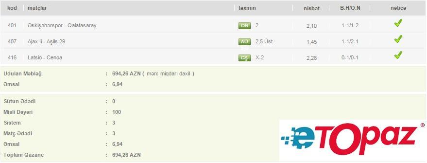 3 oyun üzrə 100 manatlıq kupon - udulan məbləğ 694 AZN