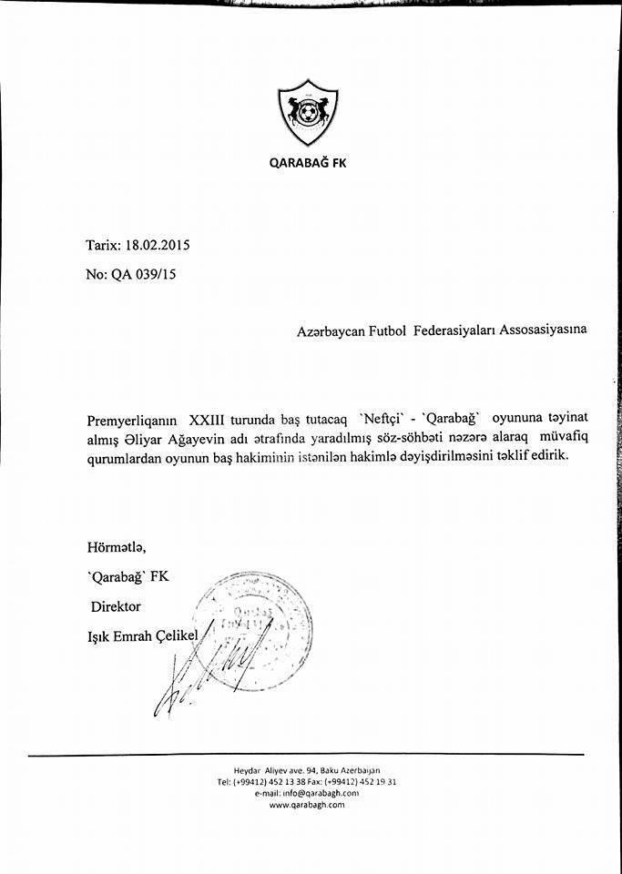 Qol.Az-ın xəbərinə görə, klubun direktoru Əmrah Çəlikəlin imzası ilə federasiyaya göndərilən müraciətdə bildirilib: “Neftçi” – “Qarabağ” oyununa təyinat almış Əliyar Ağayevin adı ətrafında yaranmış söz-söhbətləri nəzərə alaraq müvafiq qurumlardan oyunun baş hakiminin istənilən hakimlə dəyişdirilməsini təklif edirik”.