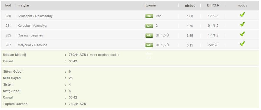 4 oyun üzrə 25 manatlıq kupon - udulan məbləğ 760 AZN