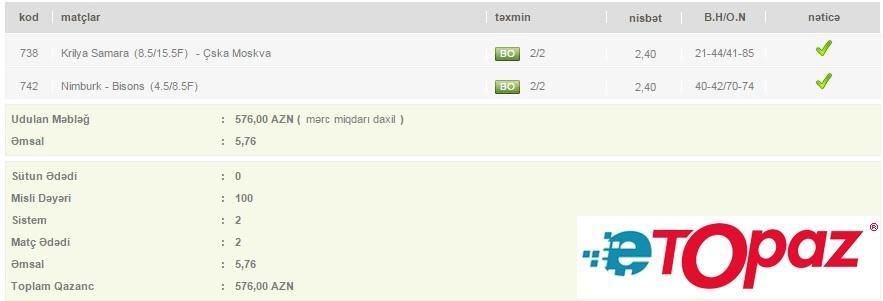 2 oyun üzrə 100 manatlıq kupon - udulan məbləğ 576 AZN