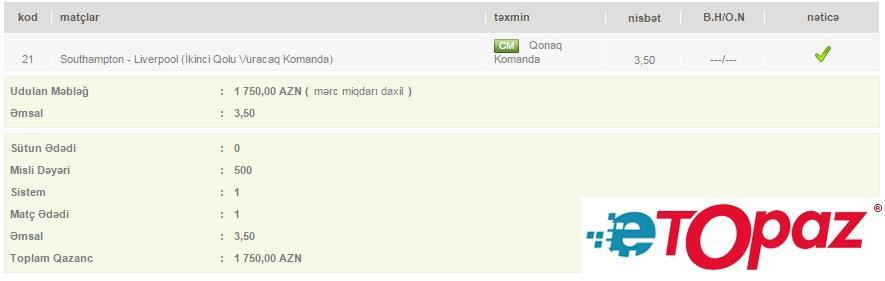 1 oyun üzrə 500 manatlıq kupon - udulan məbləğ 1750 AZN