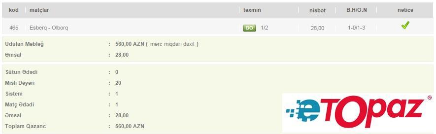 1 oyun üzrə 20 manatlıq kupon - udulan məbləğ 560 AZN