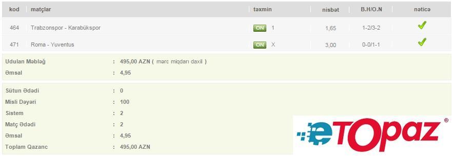 2 oyun üzrə 100 manatlıq kupon - udulan məbləğ 495 AZN