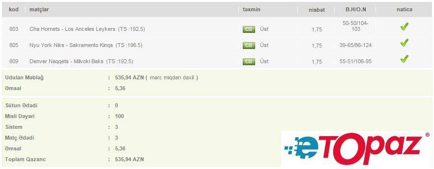 3 oyun üzrə 100 manatlıq kupon - udulan məbləğ 535 AZN
