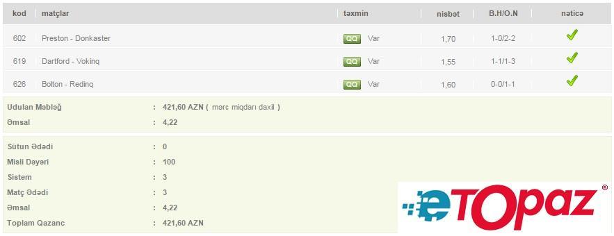 3 oyun üzrə 100 manatlıq kupon - udulan məbləğ 421 AZN