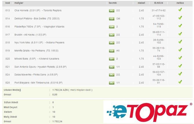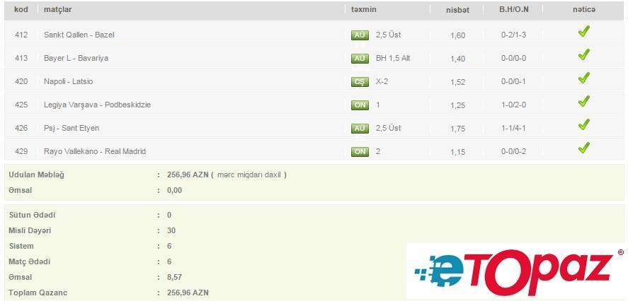 Azərbaycanda mərc oyunlarının yəganə qanuni elektron ünvanı - www.etopaz.az –da 8 aprel tarixdəki bəzi uduşlu kuponlar