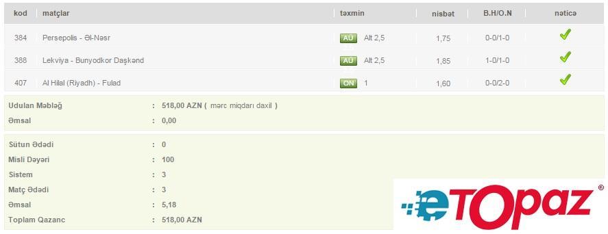3 oyun üzrə 100 manatlıq kupon - udulan məbləğ 518 AZN