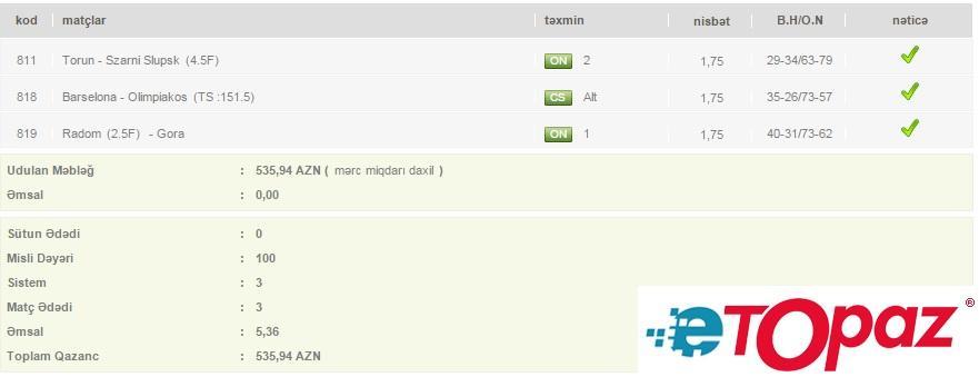 3 oyun üzrə 100 manatlıq kupon - udulan məbləğ 535 AZN