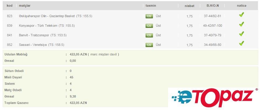 4 oyun üzrə 45 manatlıq kupon - udulan məbləğ 422 AZN