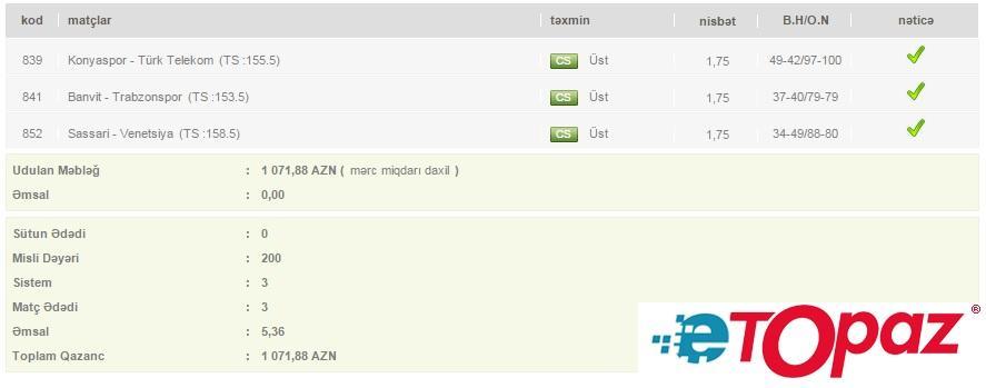Azərbaycanda mərc oyunlarının yəganə qanuni elektron ünvanı - www.etopaz.az –da 3 may tarixdəki bəzi uduşlu kuponlar
