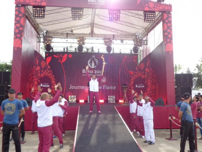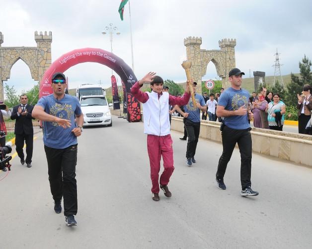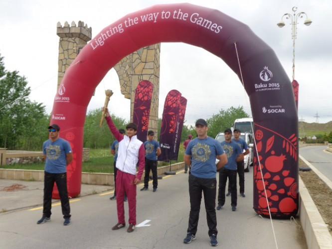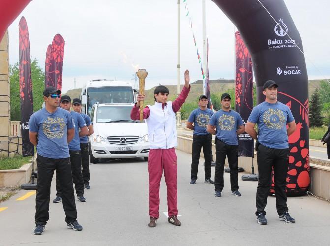 Birinci Avropa Oyunlarının rəmzi qapısında Hacıqabul şəhər 5 saylı tam orta məktəbin şagirdi Əli Rüstəmov məşəli qəbul etdikdən sonra yürüşə start verilib. On məşəlçi 3,9 kilometr məsafədə yürüşə başladı. İdmançılar Məhəmməd Əsədov, İsmət Qayıbov küçələri və Heydər Əliyev prospekti boyunca hərəkət etməklə, məşəli şəhərin mərkəzi meydanına gətiriblər.