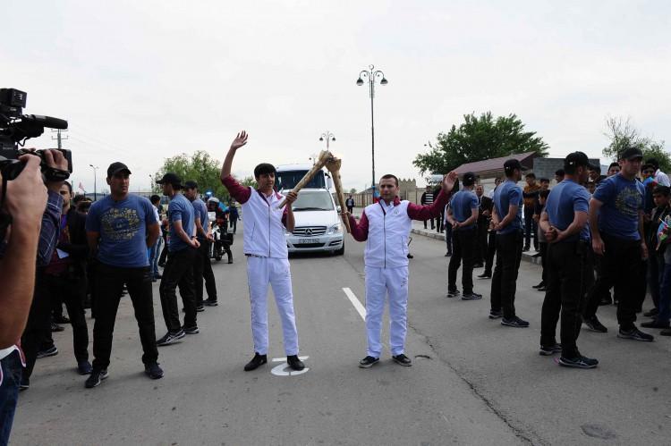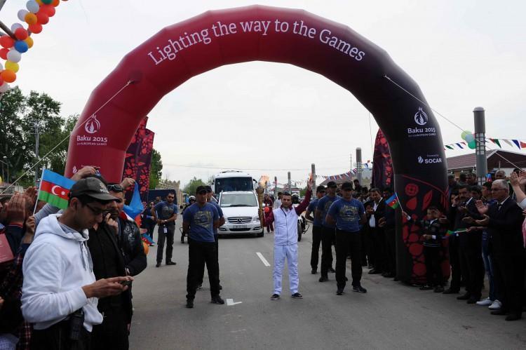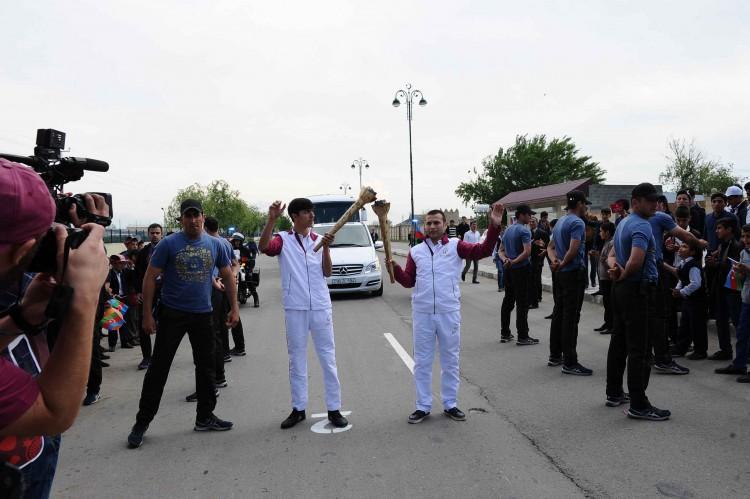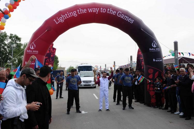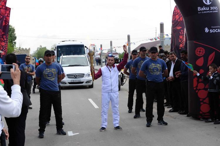 Avropa Oyunlarının rəmzi qapısında İmişli Şəkər Zavodunun əməkdaşı Məmməd Abıyev məşəli qəbul edib. Sonra 10 məşəlçi 4,1 kilometr məsafədə yürüşə başlayıb. Növbə ilə məşəli bir-birinə ötürən idmançılar Heydər Əliyev prospekti və 20 Yanvar küçəsi boyunca hərəkət edərək Heydər Əliyev parkına gəliblər.