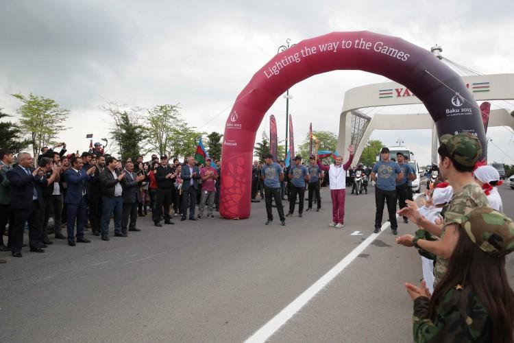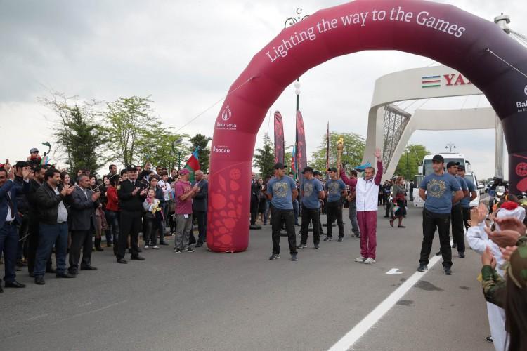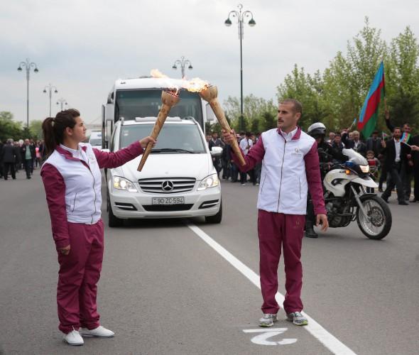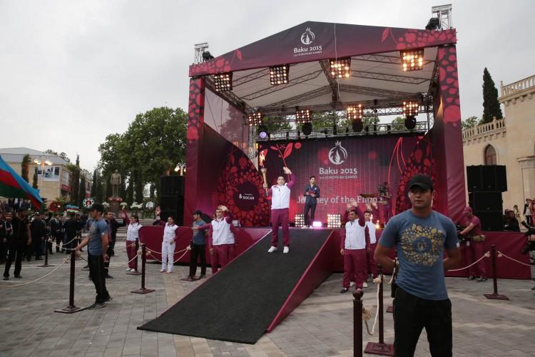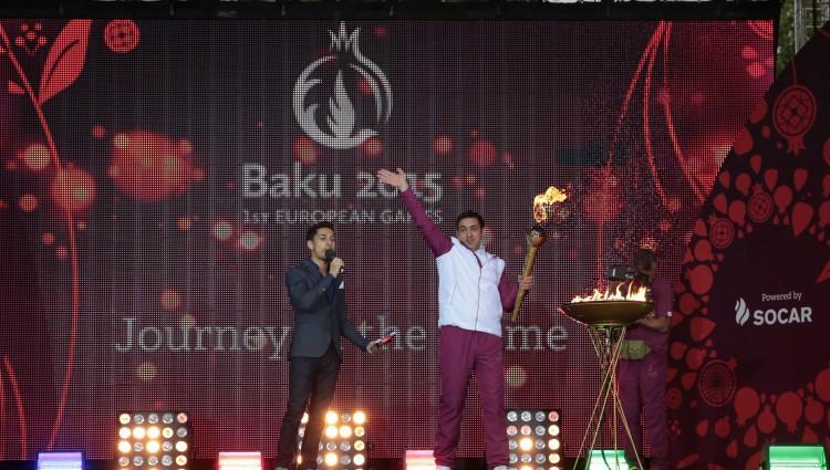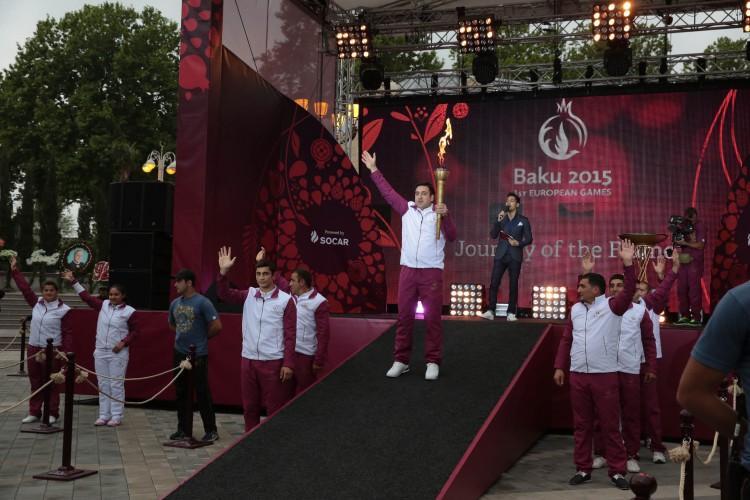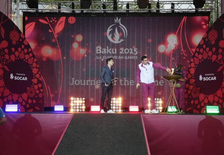 Sonra birinci Avropa Oyunlarının çırağı yandırılaraq ictimaiyyətə təqdim edilib. Çıraq yarışların sonuna qədər “Bakı-2015”in rəmzi kimi rayonda saxlanılacaq.
